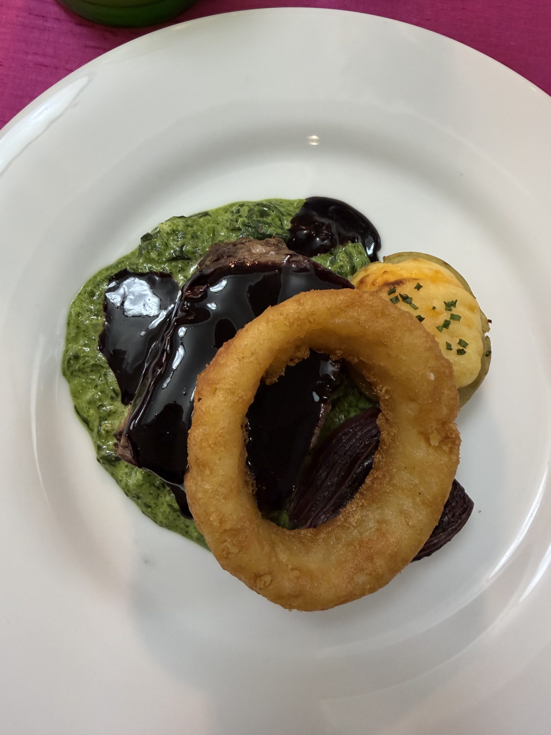 18 Hour Slow-Roasted Short Rib, Barolo Sauce, Creamed Spinach, Wine-Braised Shallot, Double-Stuffed Potato, Crispy Golden Onion Ring