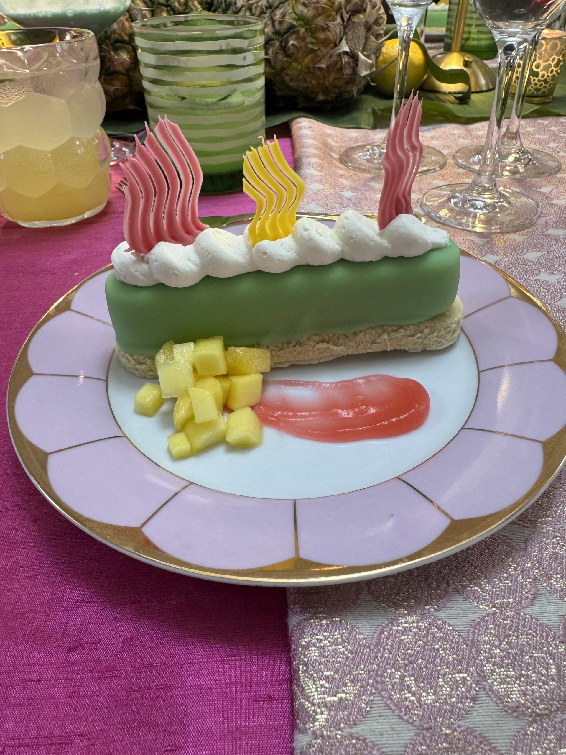 Key Lime Mousse, White Chocolate Shell Coating, Gluten Free Vanilla Cake, Diced Mango, Pink Grapefruit Gel, Whipped Cream, Chocolate Filigrees